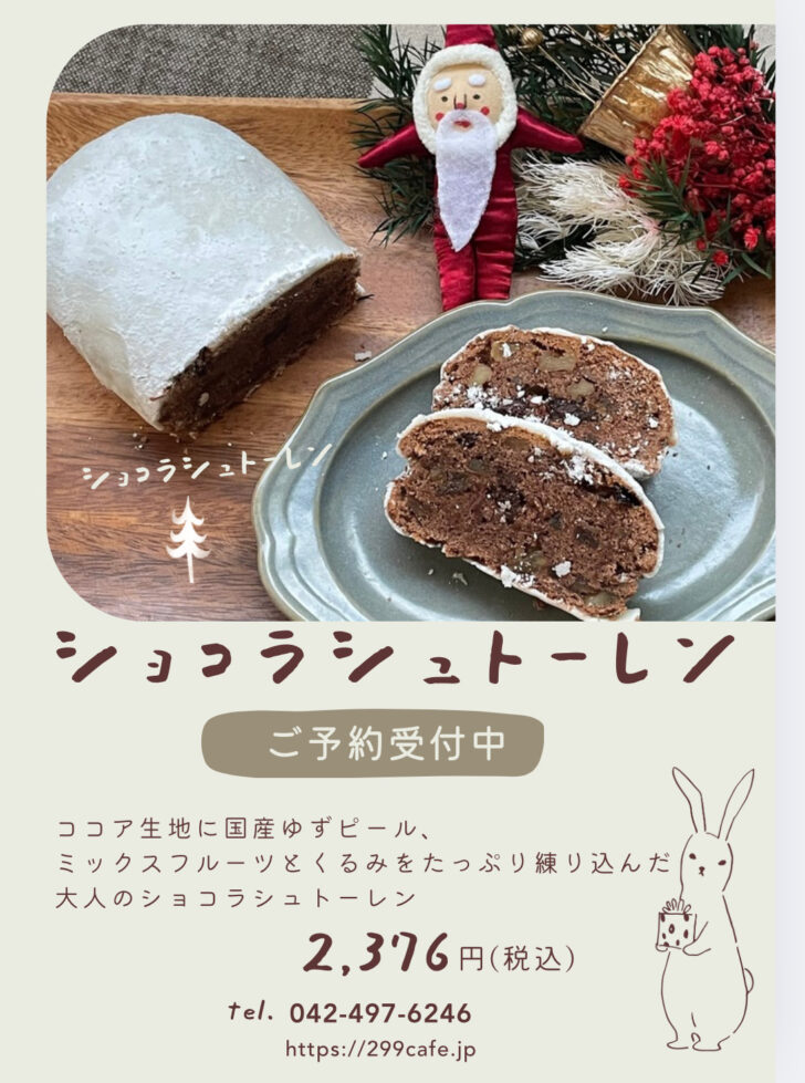 ショコラシュトーレン ココア生地に国産ゆずピール、ミックスフルーツとくるみをたっぷり練り込んだ大人のショコラシュトーレン。こちらのページよりご予約できます。 お申込み完了後、すぐにこちらからメールが送信されますが、 迷惑メール等の設定によりメールが届かない場合があります。 その場合はこちらをご確認頂き、再度お試しくださいませ。 キャンセルについて【必須】 注文後のキャンセルは不可です。 了承しました。 個数 ショコラシュトーレン:—以下から選択してください—12345 受け取り方法 お渡しのみです。 店内ご利用の方は別途席の予約もお願い致します。 引き取り希望日時 平日は11:00~15:30、土曜日、祝日は11:00~17:30、日曜日は11:00~21:30までとなります。 (12/24(水)19:00~22:00、12/25(木)11:00~22:00で夜も営業します。) 店内混雑時お待たせしてしまう場合があります。14:00~16:00が比較的空いております。 最終引き取り日:12/29(月) 引き取り時間 —以下から選択してください—11:0011:3012:0012:3013:0013:3014:0014:3015:0015:3016:0016:3017:0017:3018:0018:3019:0019:3020:0020:3021:0021:30 お客様情報【必須】 お名前 ふりがな 電話番号 メールアドレス その他ご希望やご質問 【うまく申し込み出来ない場合】 必要事項を記入し「299cafeshop★gmail.com」よりお申し込みください。 ※「★」を@マークに変換してください。